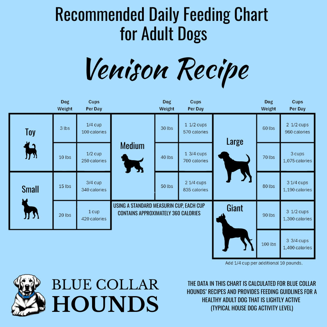 With Blue Collar Hounds...it's simple! Based on the feeding chart, determine how many cups to feed per day, based on your dogs weight.